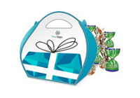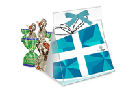 Размер 170х160х83 мм, картон 300 г/м2, вес конфет около 200 г.